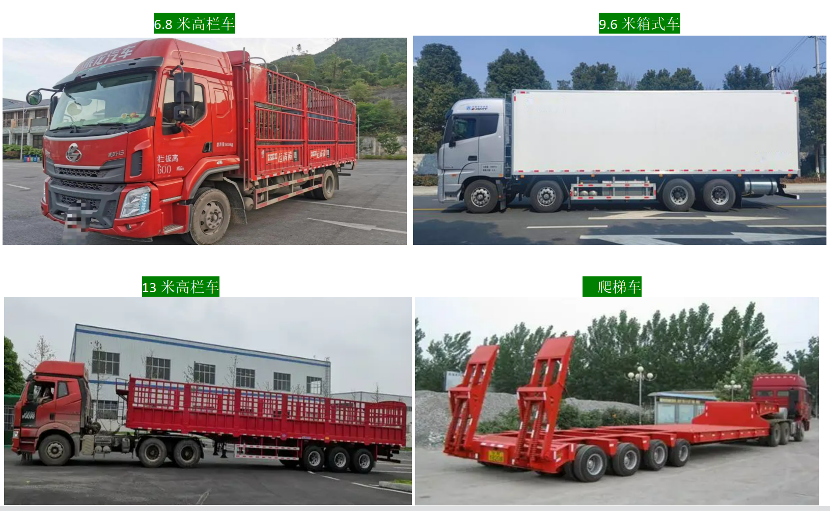 速龙结合自有车辆+加盟车辆+社会资源,目前可调配各种车型500余量,包含(面包车、依维柯、微货、4.2米、6.8米、9.6米、13米、16米、17.5米、爬梯车、特种车)
